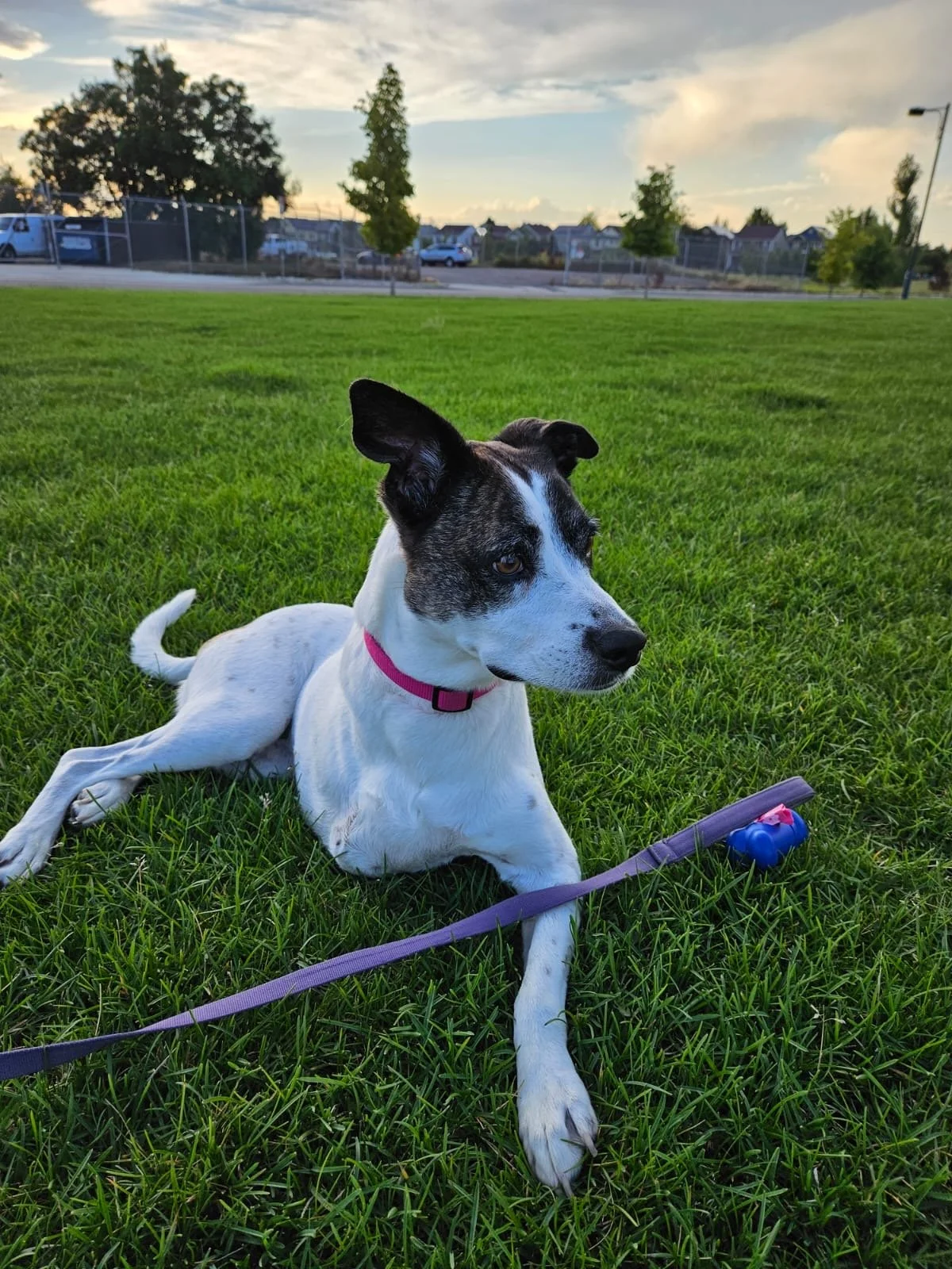 A dog with a white coat and black markings on its face, lying on green grass in a park, with a purple leash attached to its collar and a blue rubber toy in front of it, during sunset or early evening.