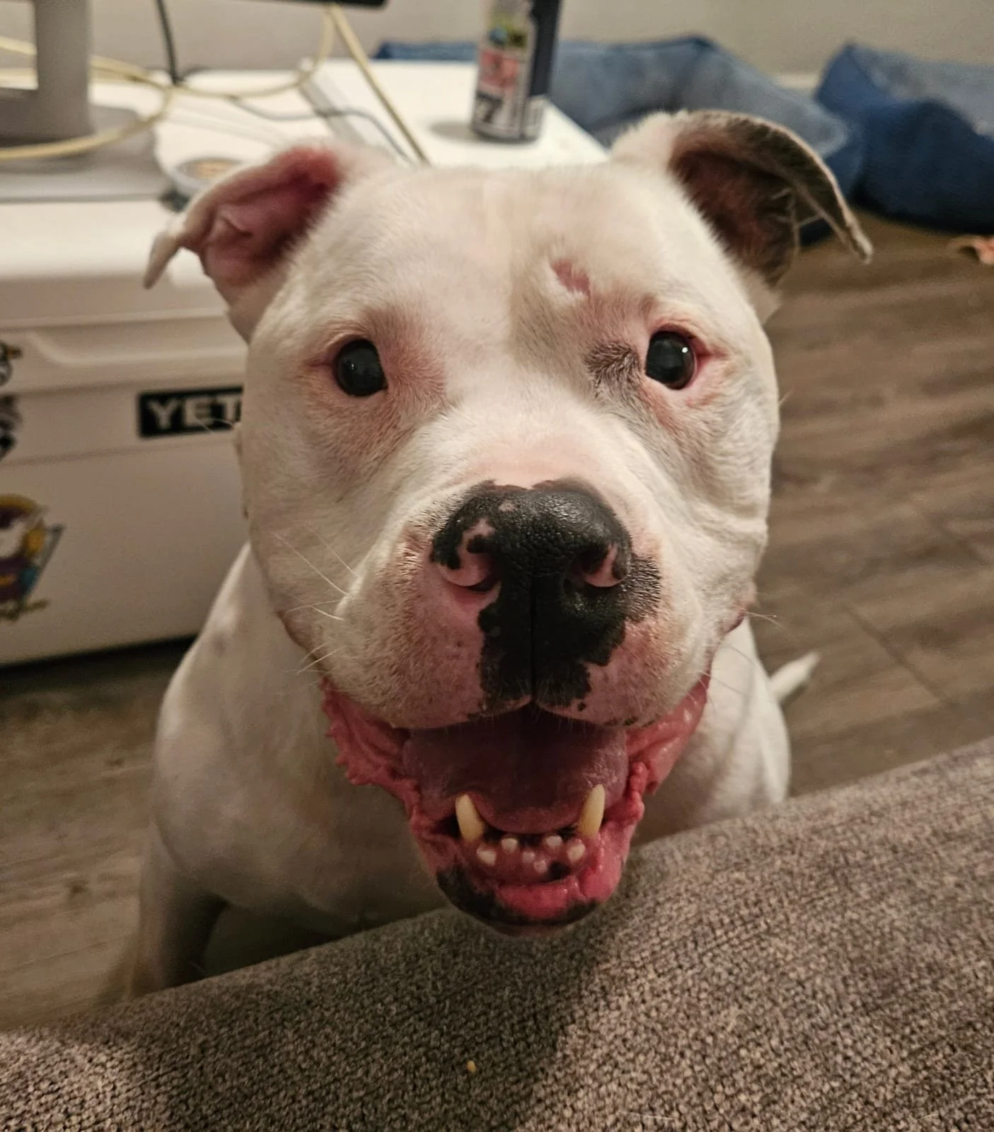 A happy white dog with a black nose and some spots, showing its teeth and tongue, with a partly closed eye and an odd eye appearance.