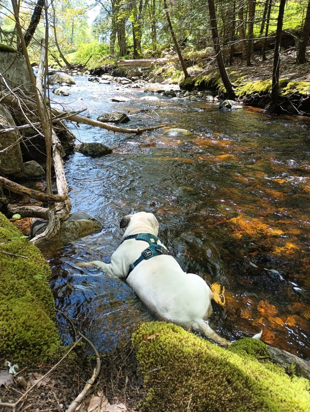 A white dog with a harness wading in a shallow, rocky stream in a forest with green moss and trees.